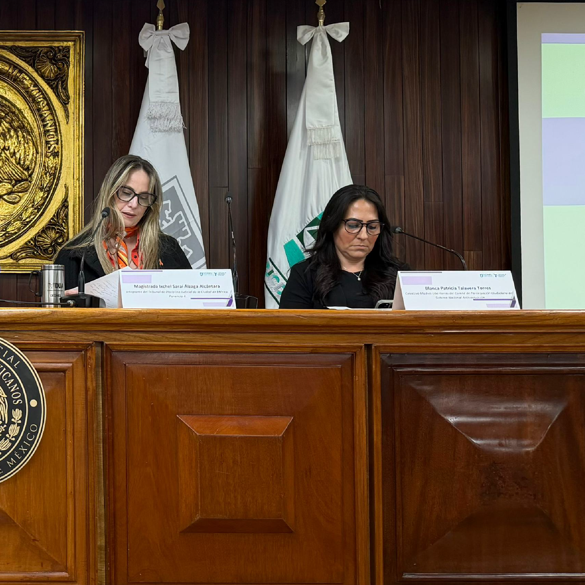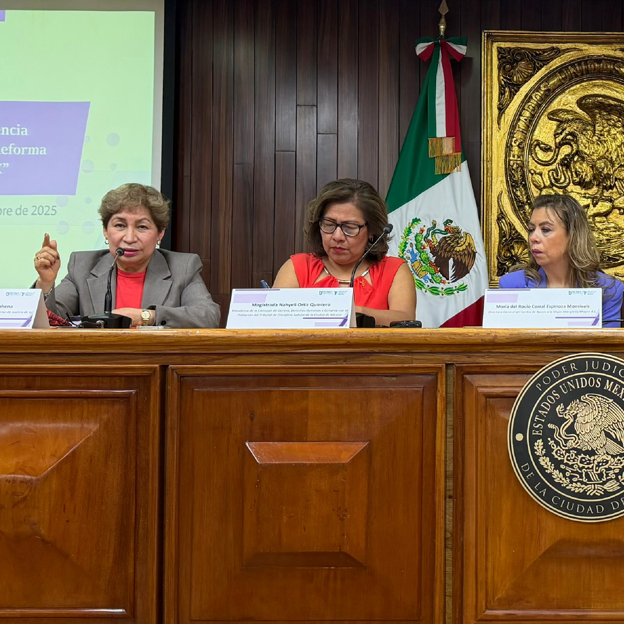 De manera paralela, se realizó la conferencia La Función Judicial frente a la Violencia de Género: Avances y Desafíos tras la Reforma Constitucional Judicial en la CDMX, encabezada por la presidenta de la Comisión de Género, Derechos Humanos y Cercanía con la Población del TDJ, magistrada Nayheli Ortíz Quintero, la cual reunió a mujeres dedicadas a la labor jurisdiccional y de organizaciones sociales, tales como las magistradas del TSJCDMX, Celia Marín Sasaki y Edilia Rivera Bahena; la directora General del Centro de Apoyo a la Mujer Margarita Magón A. C., María del Rocío Corral Esponiza Monsiváis; y la integrante del Colectivo Madres Libertarias del Comité de Participación Ciudadana del Sistema Nacional Anticorrupción, Blanca Patricia Talavera Torres.