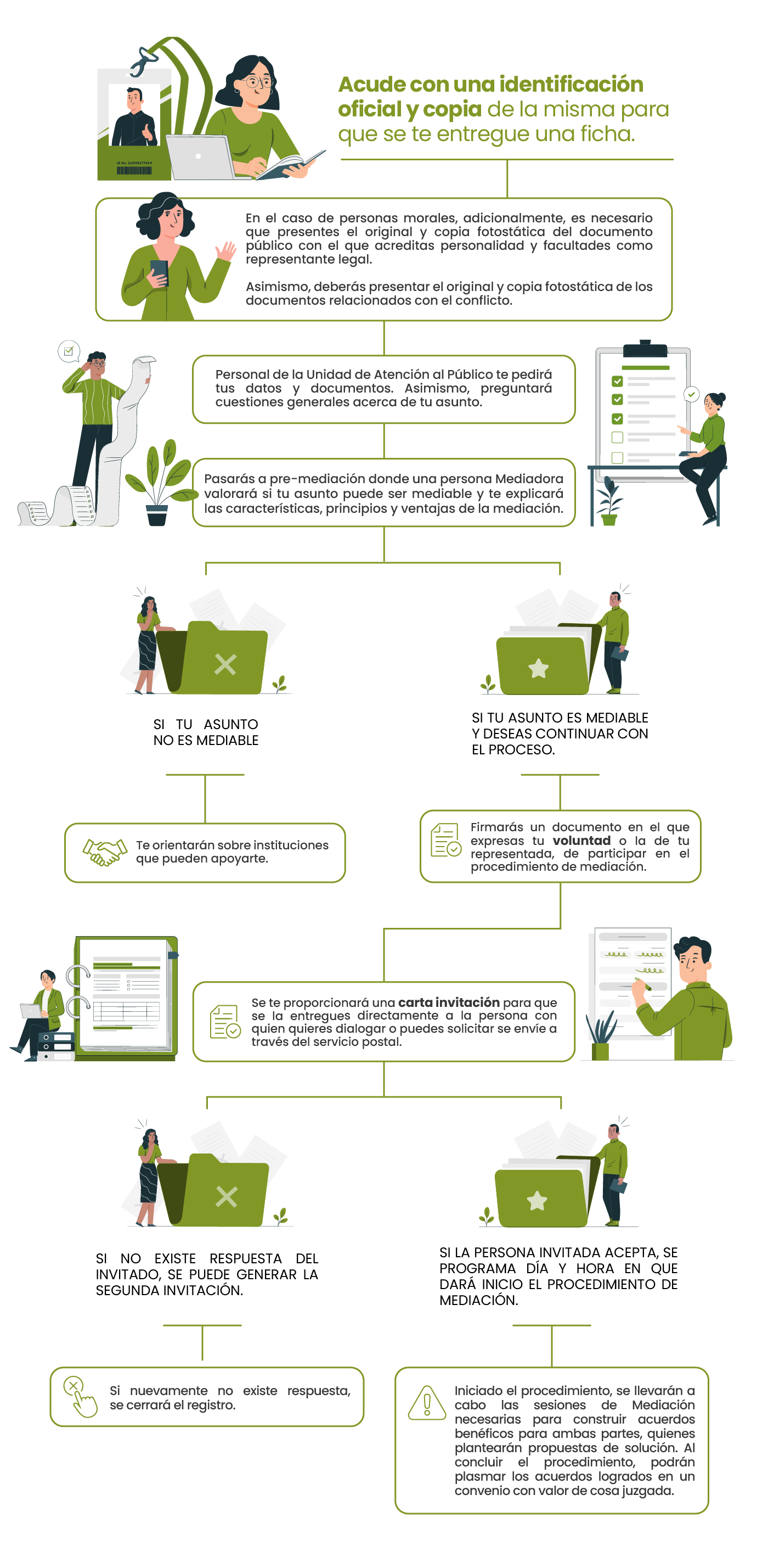 Asimismo, deberás presentar el original y copia fotostática de los documentos relacionados con el conflicto. El Personal de la Unidad de Atención al Público te pedirá tus datos y documentos. Asimismo, preguntará cuestiones generales acerca de tu asunto. Pasarás a pre-mediación donde una persona Mediadora valorará si tu asunto puede ser mediable y te explicará las características, principios y ventajas de la mediación. Si tu asunto no es mediable te orientaremos sobre instituciones que pueden apoyarte. Si tu asunto es mediable y deseas continuar con el procedimiento, firmarás un documento en el que expresas tu voluntad o la de tu representada, de participar en el procedimiento de mediación. Se te proporcionará una carta invitación para que se la entregues directamente a la persona con quien quieres dialogar o puedes solicitar se envíe a través del servicio postal. Si no existe respuesta del invitado, se puede generar la segunda invitación y si nuevamente no existe respuesta, se cerrará el registro.