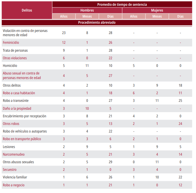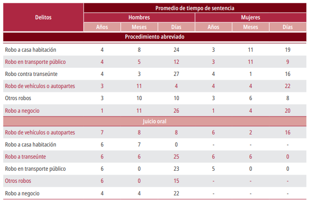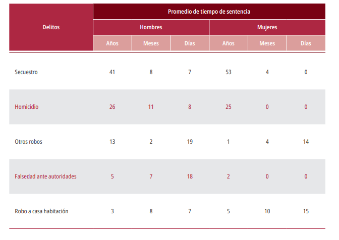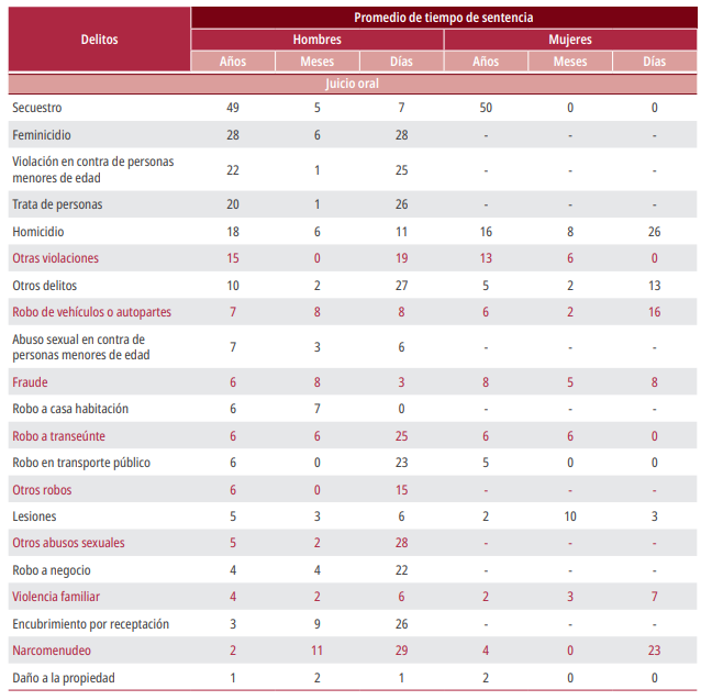 Notas: El promedio de tiempo de sentencia se obtiene de la suma de todos los tiempos de sentencia emitidos en el año por tipo de delito, divididos entre el número anual de sentencias por tipo de delito.